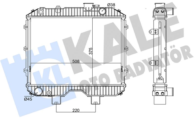 Конструкция радиатора : Ребра охлаждения припаянные Материал ребра охлаждения : алюминий Материал бачка (радиатор) : полимерный материал Глубина сети [мм] : 40 Длина сети [мм] : 375 Ширина сети [мм] : 508 Впускной диаметр [мм] : 45 Выпускной диаметр [мм] : 38