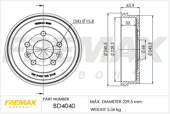 Наружный диаметр тормозного барабана [мм] : 260