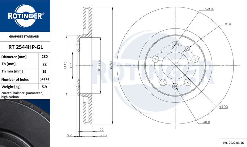 Толщина тормозного диска (мм) : 22