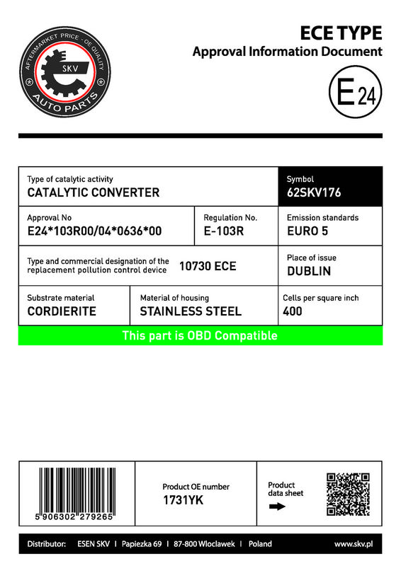 Изделие соответствует : Euro 5